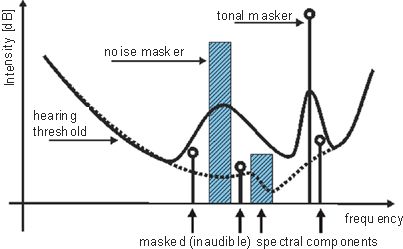 The sink coding part of the MPEG audio encoder is realized through taking into account masking phenomena [14,15,19]. Masking occurs if two or more simultaneous tonal or narrowband noise components are close to each other in frequency domain. Weaker components are masked by stronger components due to local elevation of the hearing threshold - those parts that fall below the modified threshold are effectively too weak to invoke any auditory sensation (they become inaudible).
