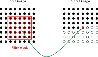 Processing with FIR filter may be interpreted as filter mask sliding over input image and producing (by multiplying and summing) the output image samples. See the picture below for N1 = N2 = 2 example.