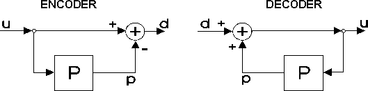 For calculation a prediction value "p" in the encoder, we use only pixels previously known to the decoder. Usually we combine the values of only a few neighboring pixels to obtain a predicted value. See the picture below where "u" is the value to be predicted, "a" is the value of previously decoded pixel value of the same line and "b", "c" are values in previous line. The pixel at (0, 0) have to be sent with original value - no values are known in decoder so far. Other pixels at the first row will use "a" as a prediction and at the first column will use "b" .